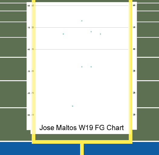 Maltos went 5 for 5 on field goals with the longest being from 53 yards. 4 of his field goals were 47 yards or longer. He also made both extra points. The majority of his kicks were tightly down the middle.
